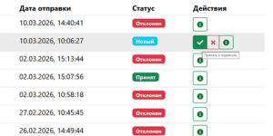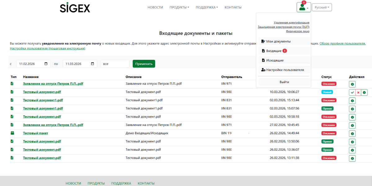 Входящие документы получают статусы «новый», «принятый», «отклоненный». Документы с пометкой «новый» могут быть приняты и подписаны, или же отклонены получателем. Пользователь может написать комментарий к документу, который будет отправлен первому подписанту.