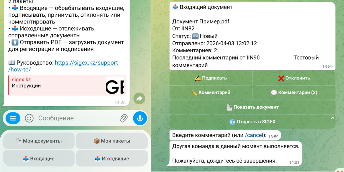 Настоящая инструкция описывает возможности Telegram bot SIGEX для просмотра документов пользователя и действий над ними.